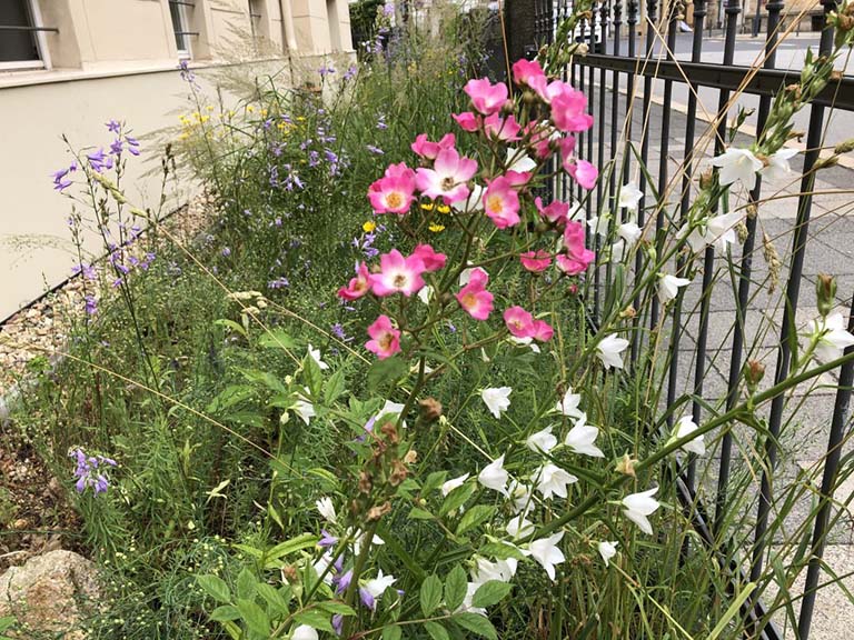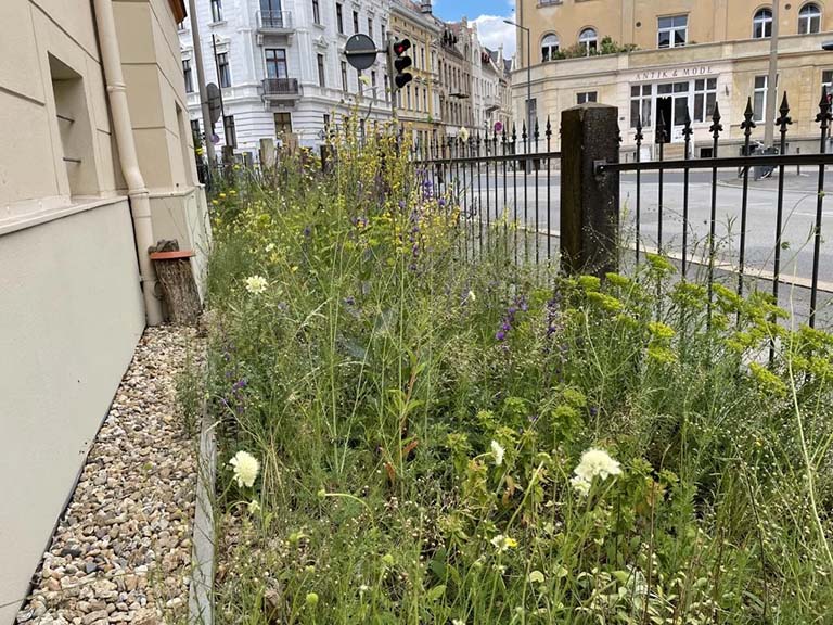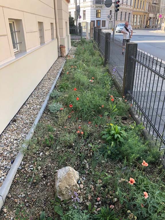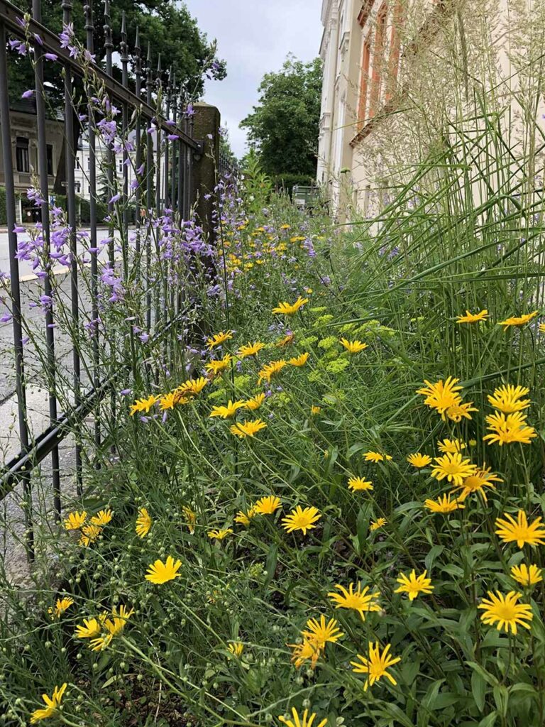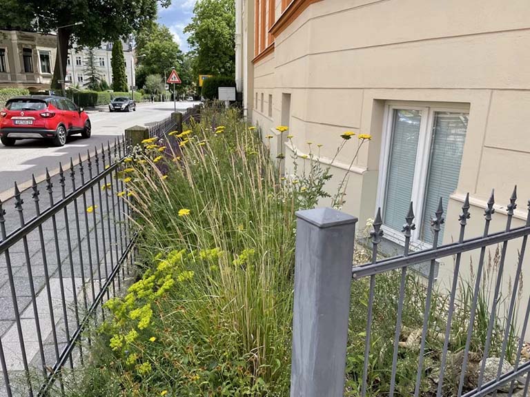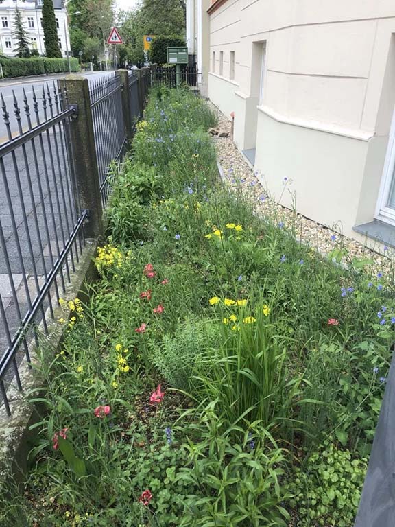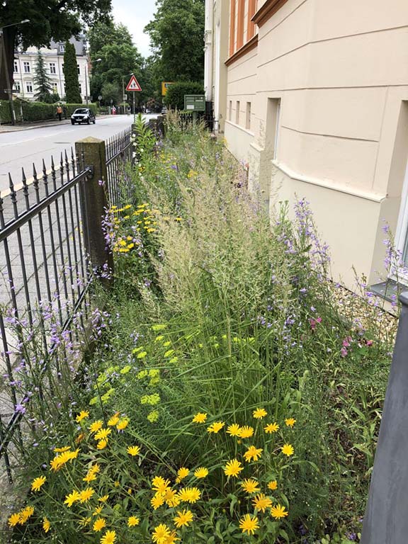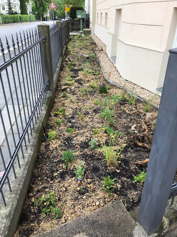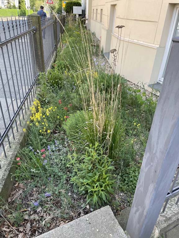 Dass schöne Naturgarten-Blumenbeete mit vielen heimischen Arten und hohem ökologischen Wert für Insekten und Co. in der Stadt möglich sind, da können sie sich am Mühlweg 23 (Ampel Ecke Bismarckstr./Schützenweg) in Görlitz auf 40 m2 selbst ein Bild machen. Hier pflanzten wir für die Familie Lehmann im Mai 2020 über 200 Stauden und 500 Blumenzwiebeln bzw. -knollen mit insgesamt 39 verschiedenen Arten aus Bioanbau in nährstoffarmes mageres Sand-Schotter-Gemisch anstatt in hochgedüngte Torferde. Das Ergebnis lässt sich sehen, obwohl der Standort im Regenschatten gelegen ist und extra trocken ist.