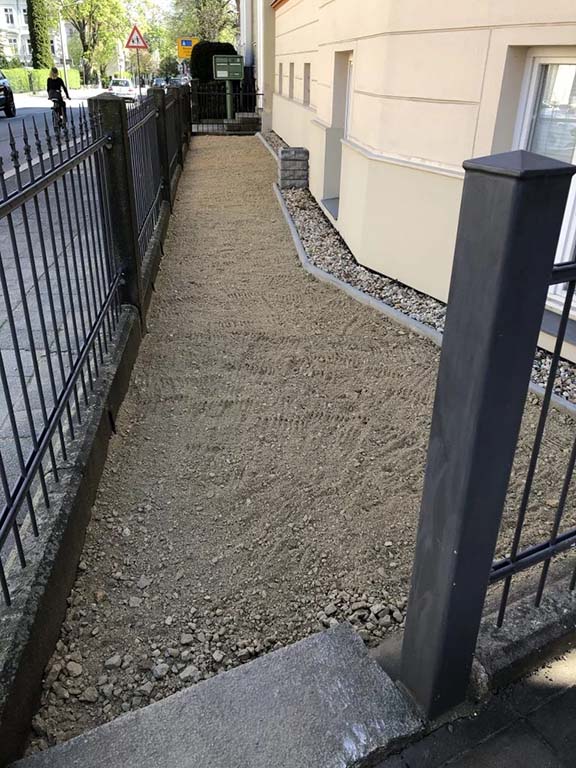 Zunächst wurde das alte Erdreich ca. 15 cm tief entfernt und 20-25 cm hoch mit Mineralgemisch, also einem Gemisch aus Sand und Schotter aufgefüllt. Anschließend wurde eine 1-2 cm dicke Schicht ungedüngter Komposterde aufgebracht.