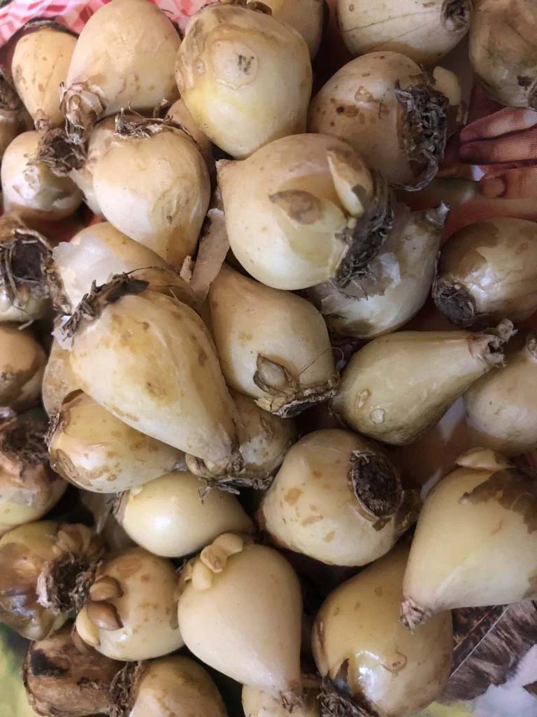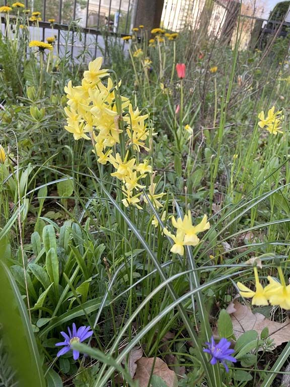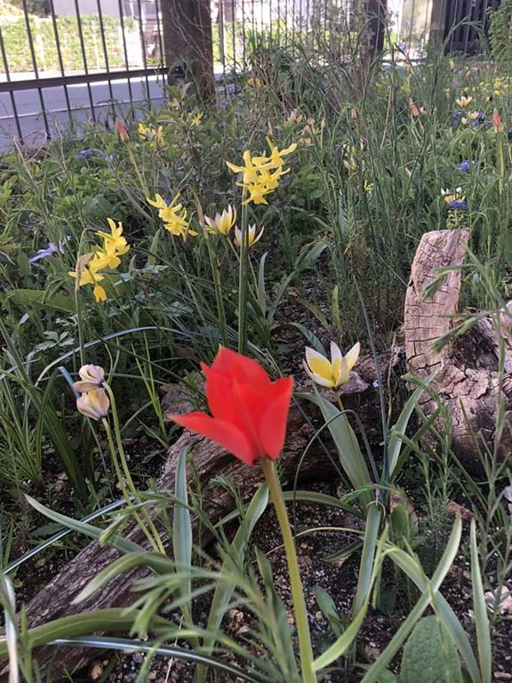 Im September 2020 erfolgte dann das Setzen der 500 Zweibeln und Knollen. Darunter Arten wie Gold-Krokus, Weißer Krokus, Strahlen-Anemone, Wildtulpen (Tulipa linifolia, T. tarda), Traubenhyazinthen und Wildform der Trompeten-Narzisse.