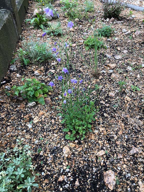 Nach ein paar Monaten sieht das Beet schon grüner aus und die ersten Blüten sind zu sehen.
