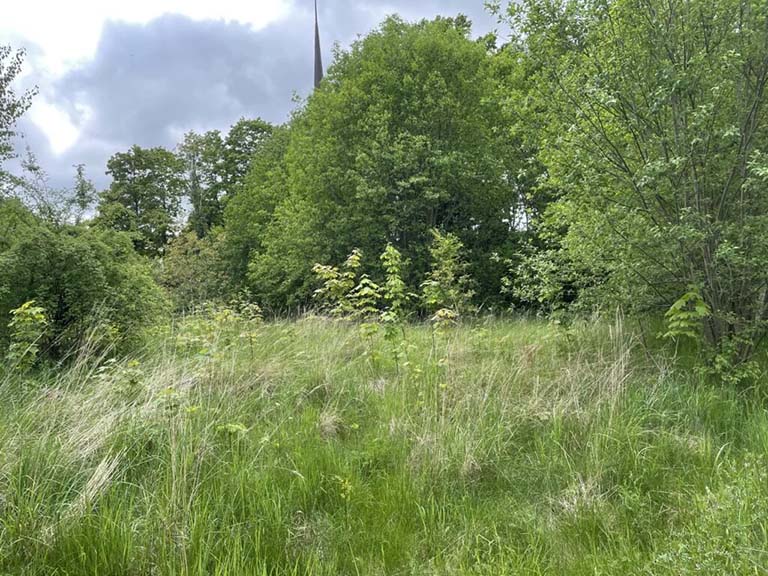 Auf dem Gelände der ehemaligen Volltuchfabrik an der Schanze in Görlitz, benachbart zum Heiligen Grab und dem Ölberggarten, setzen wir in Kooperation mit dem Eigentümer, der Stadt Görlitz, einem Schäfer und der Evangelischen Kulturstiftung Görlitz die verbrachte und verbuschte magere Wiese wieder instand. In zwei ersten großen Aktionen im Mai und November 2023 wurde die Wiese mit einem Balkenrasermäher gemäht, Büsche und Gehölze entfernt, Totholzhecken angelegt und eine Direktaussaat einer zertifizierten regionalen Samenmischung vorgenommen. Ab 2024 soll durch die zeitweise Beweidung mit Schafen die Fläche freigehalten und gepflegt werden.